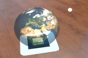 Globo terraqueo girando (iluminado con un punto de luz) se posiciona en un marcador Hiro.