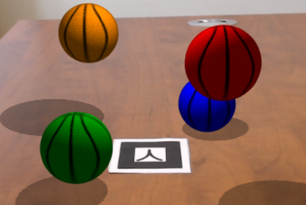 Crea cuatro pelotas de baloncesto de colores en un marcador. Las pelotas proyectan una sombra en el plano que contiene el marcador.